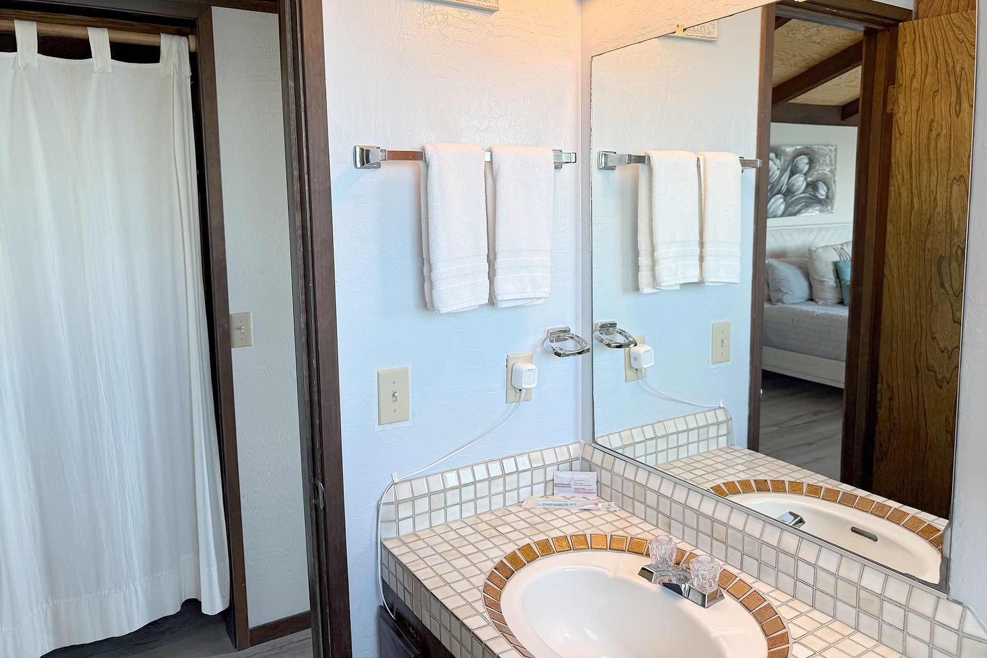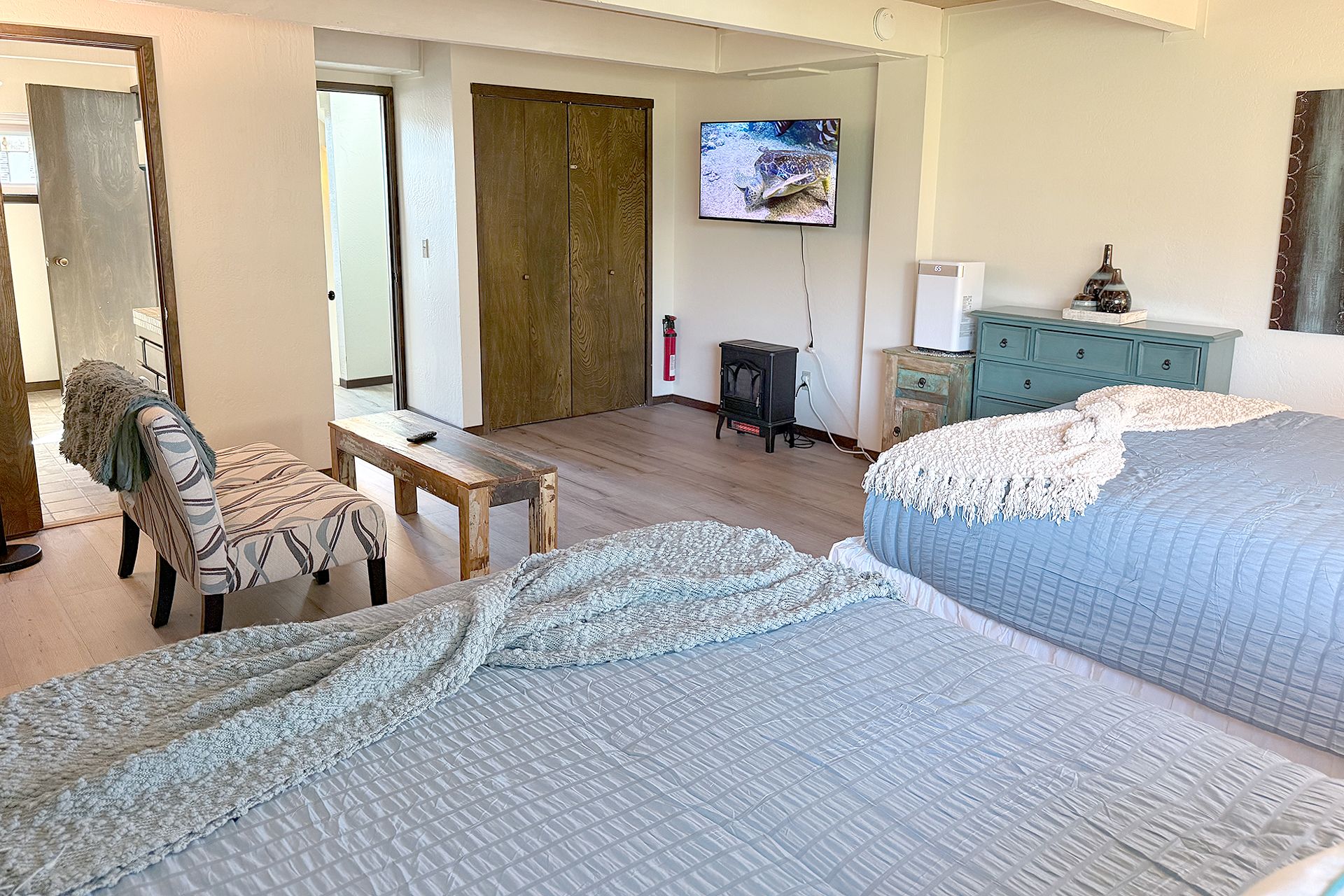 • Second bedroom (second level): Two queen beds, private bath, sitting area, TV, and in-unit laundry