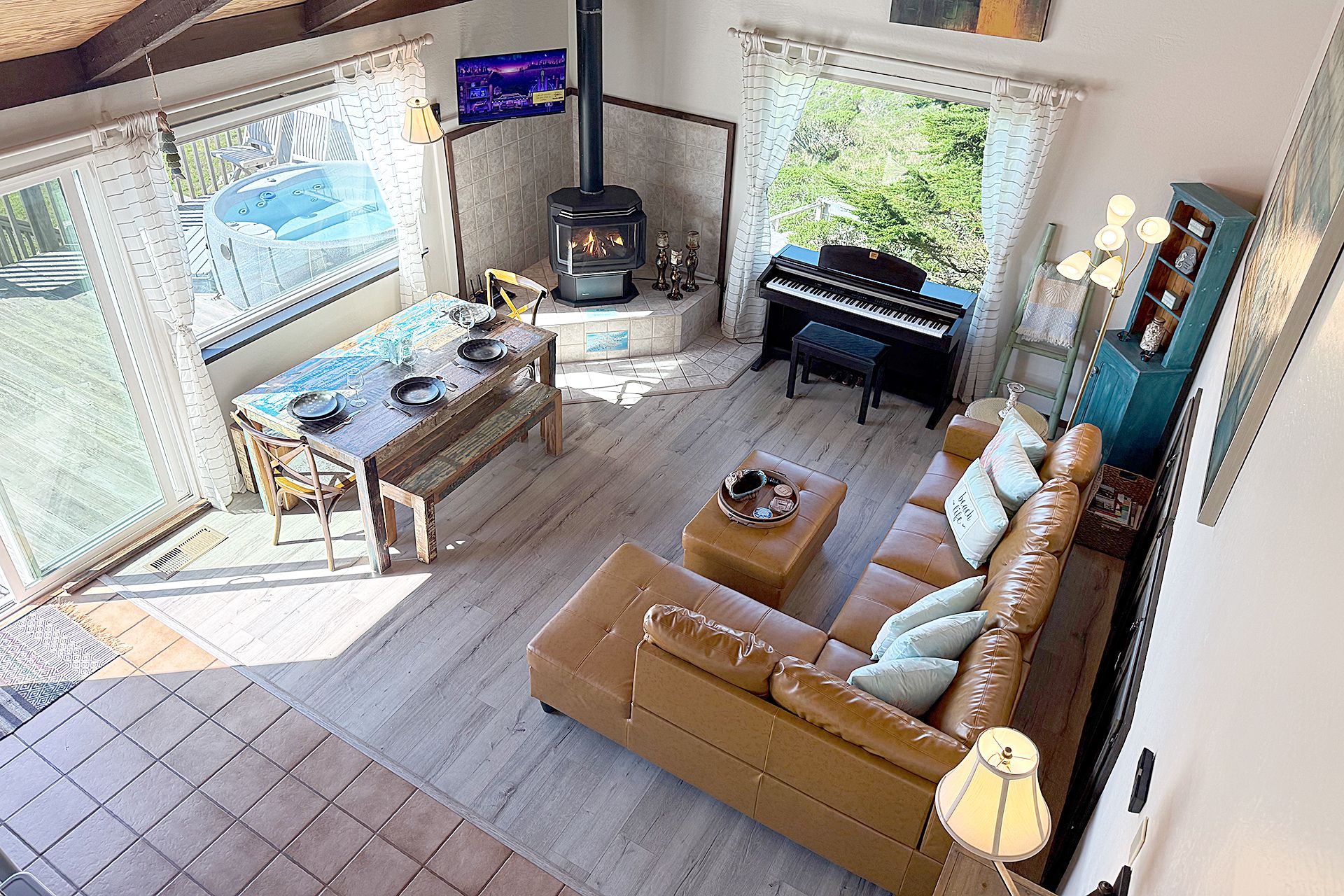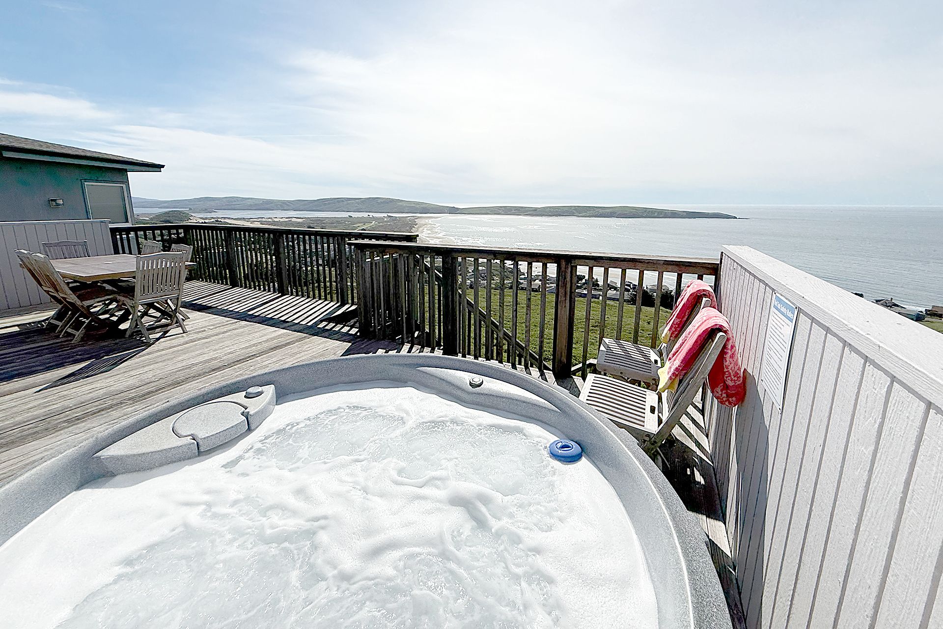 Perched above the coastline, this Dillon Beach ocean view rental offers a balance of relaxation and entertainment. It is ideal for guests searching for a Sonoma Coast vacation rental with hot tub, ocean views, game room, and beach access.
