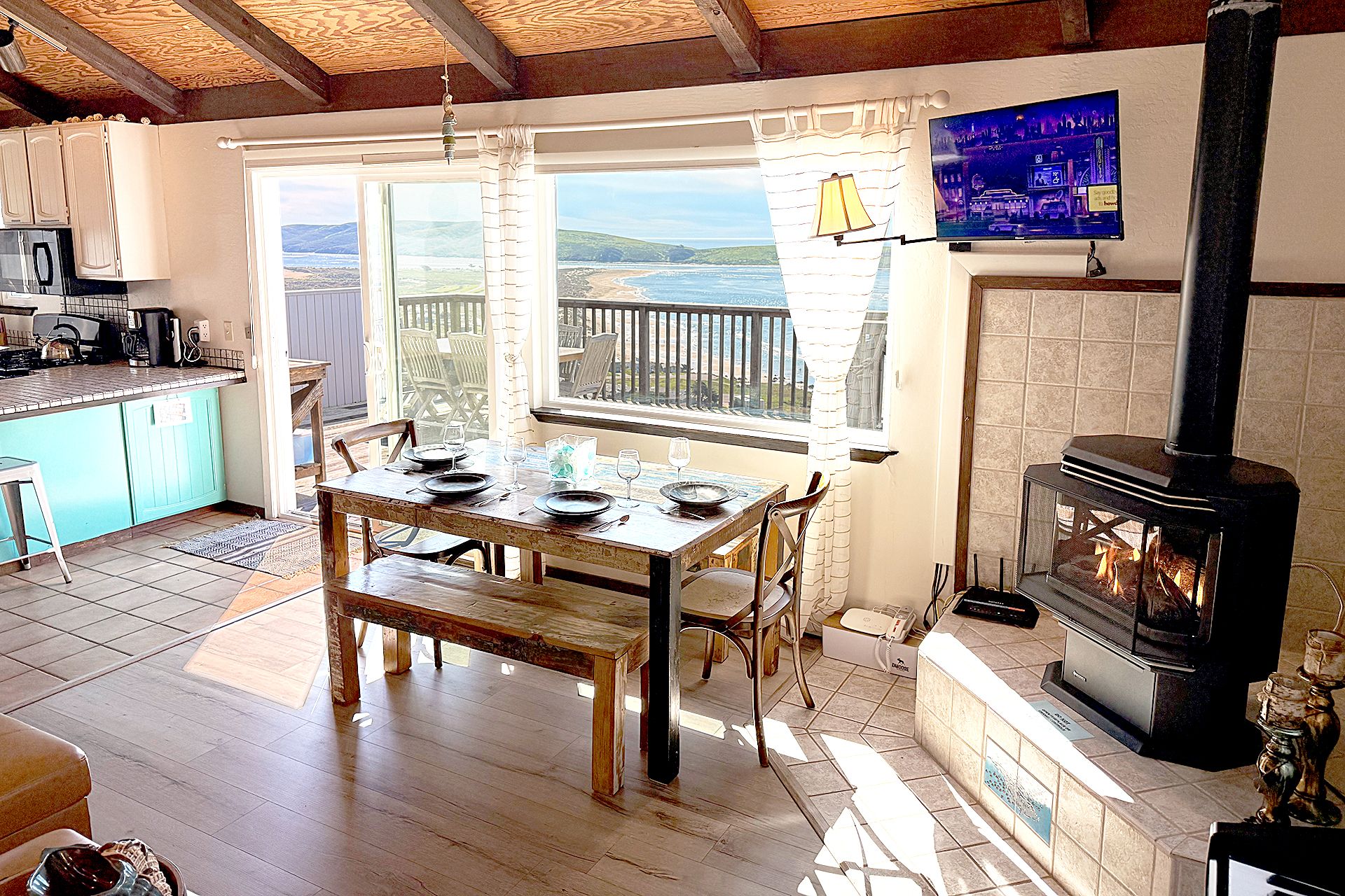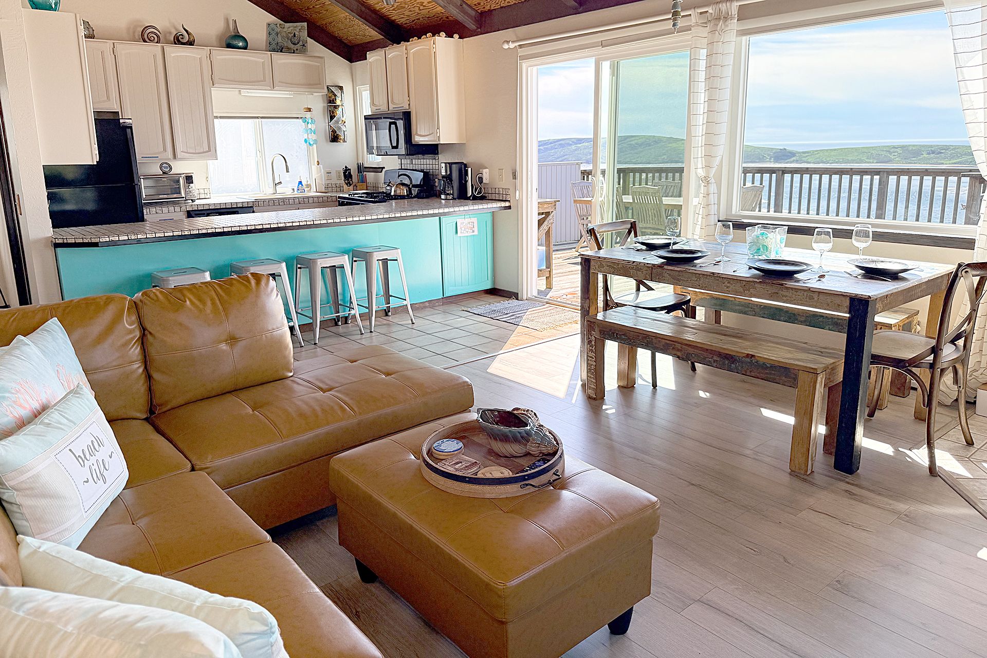 Bella Oceana is a 2-bedroom, 2-bathroom ocean view home in Dillon Beach, California, a sought-after Dillon Beach vacation rental on the Sonoma Coast, that sleeps up to 6 guests. This dog-friendly beach house features a private hot tub, full game room, multiple gathering spaces, and expansive Pacific Ocean views.