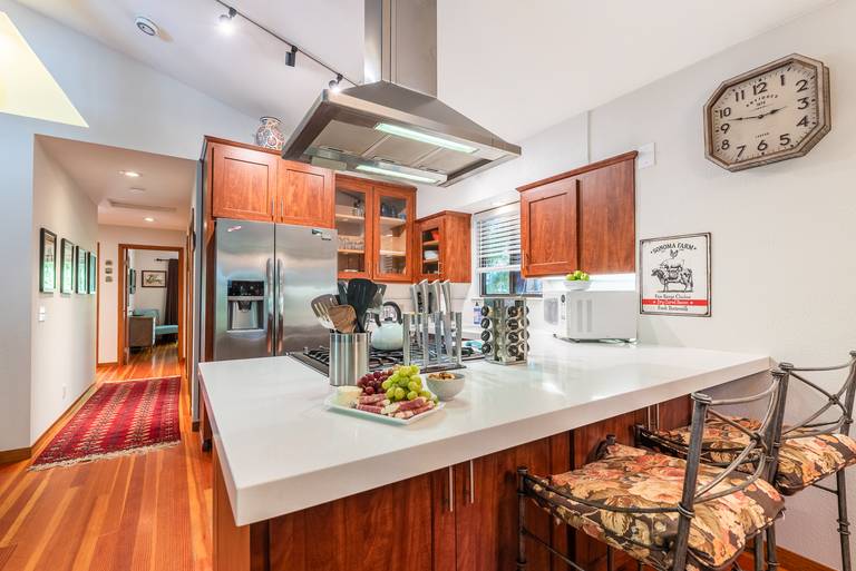 Reviewed on 2024-05-16 by JudyAbsolutely Zen was such a beautifully decorated clean home, hard wood floors, a cozy open living space, kitchen with all that we needed (great knives, pans, coffee maker), and windows to view lush landscape all around the house. Very quiet neighborhood. We had our small dog and enjoyed taking her for walks every morning amongst the towering redwoods - couldn't have been more IN nature. Very conveniently located to Guernville shops & Safeway and about 30 minutes to the beautiful coast for views, teen photo opps and hiking; loved sitting at Aquatica Cafe in Jenner! Enjoyed my cake, presents. and time with my family here, as we ride out what is hopefully the end of Covid days. The hosts made check in/out efficient and easy, reached out to check on our comfort and responded quickly to any questions we had. Would stay here again in a heart beat!