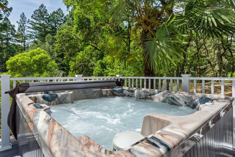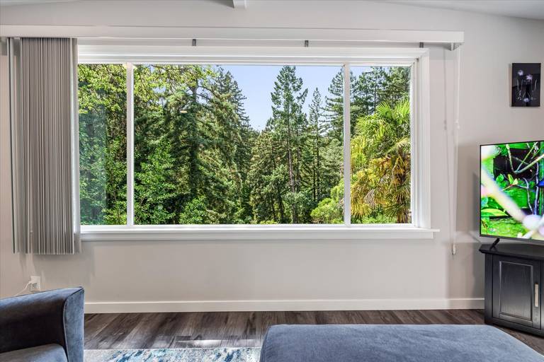 Reviewed on 2024-09-23 by LauraThe location is tranquil and beautiful. It's right off the main road, and about a 10 minute walk to the closest beach. We really enjoyed the big window overlooking the redwoods and the deck w/ hot tub. We would stay here again!