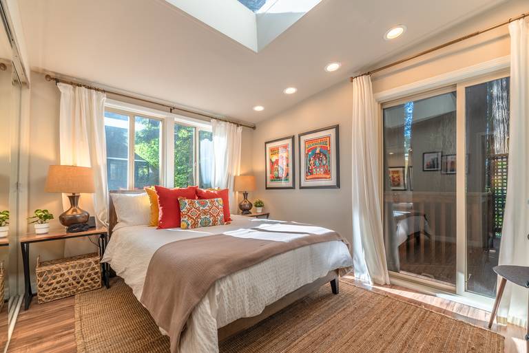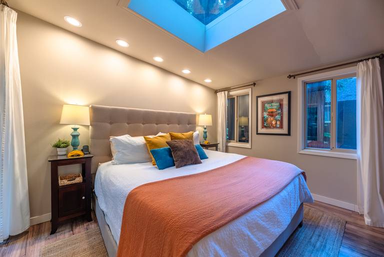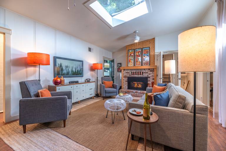 Reviewed on 2023-08-15 by JoyeThis place shows even better than the pics (which is saying something); the host has thought of everything you might need and then some nice personal touches as well (welcome basket, arcade games, monogrammed pet beds, mugs and eye masks). The moment you pull into the fenced yard and close the gate, you feel like you’re in your own little piece of the woods. The space is great (there were only two adults and two pooches on my trip) but you can easily accommodate a few couples. There are plenty of nooks to hide away in and tons of deck space to enjoy the setting. The neighborhood is very quiet and a short walk to the river makes it easy to leash the pooches and take a leisurely stroll. The kitchen has everything you might need to make a meal and there is ample seating inside and out. If you’re looking for a nice change of scenery, this is definitely worth checking out. There are so many skylights, it constantly reminds you to look up and take in the canopy. An absolutely great retreat that is thoughtfully appointed and super cozy.