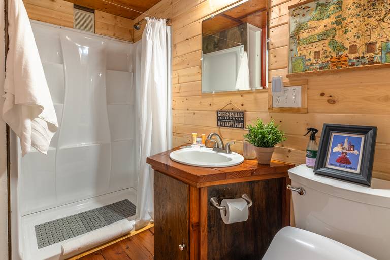 Reviewed on 2023-12-08 by Sean M. , NA, NOTAVAIL UnknownLoved staying at this place with my wife and two boys. It was absolutely immaculately clean, was well equipped, and had lots of style with many fun little quirks. From the 80s movie posters to the jukeboxes with tons of good music to the skylights that looked up into the redwoods above, it was delightful inside. Then it was a quick walk to the river and a short drive to downtown Guernville with all its fun shops and good restaurants. We hope to stay here again soon!