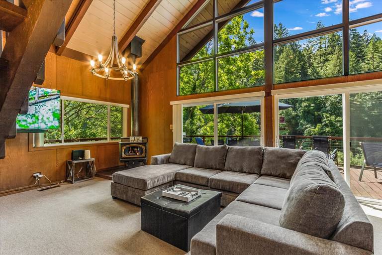 - Living room - Spacious & bright room w/ comfy sectional couch & large screen/smart TV /YouTube TV service & streaming capabilities! Wood burning stove/winter months, portable AC Unit/Summer months, sliding doors open to deck overlooking the Russian River