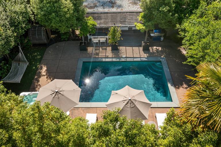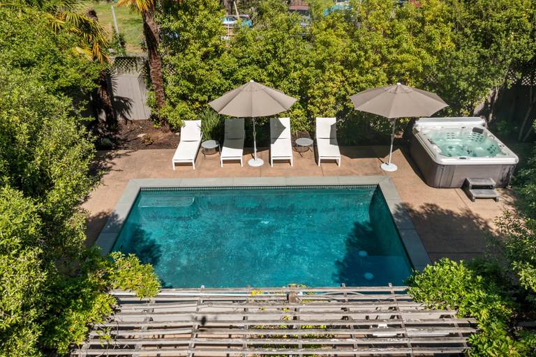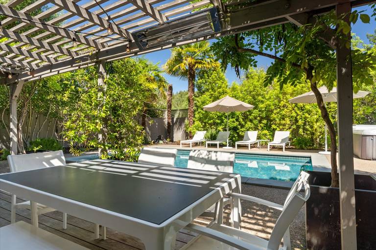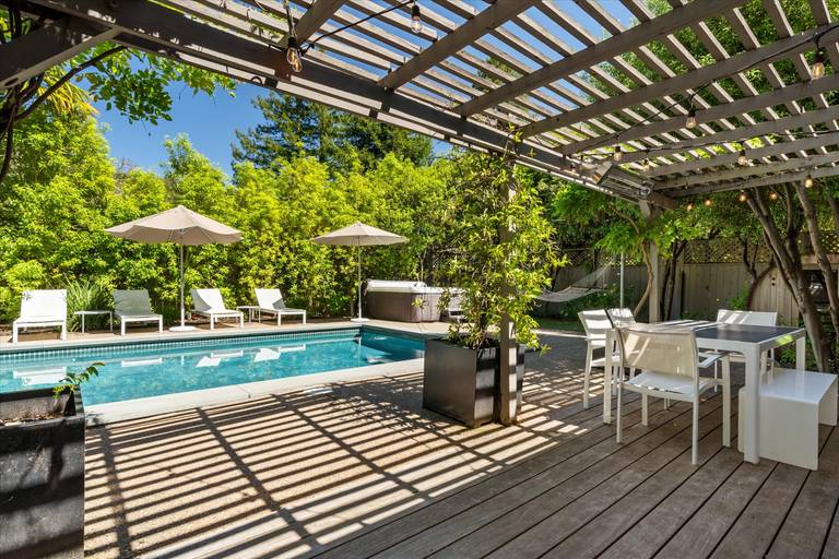 Reviewed on 2017-08-02 by kyle p. , san rafael, CA United StatesHouse was beautifully designed. Loved the backyard oasis with the swimming pool, jacuzzi, and sauna. JUst a quick ride to downtown with some amazing restaurants ... floating on my back in the pool staring up at the redwoods is just the respite I needed. I didn't want to leave