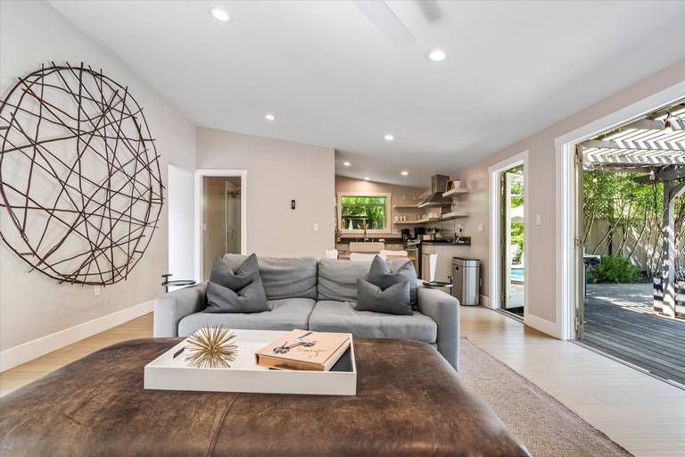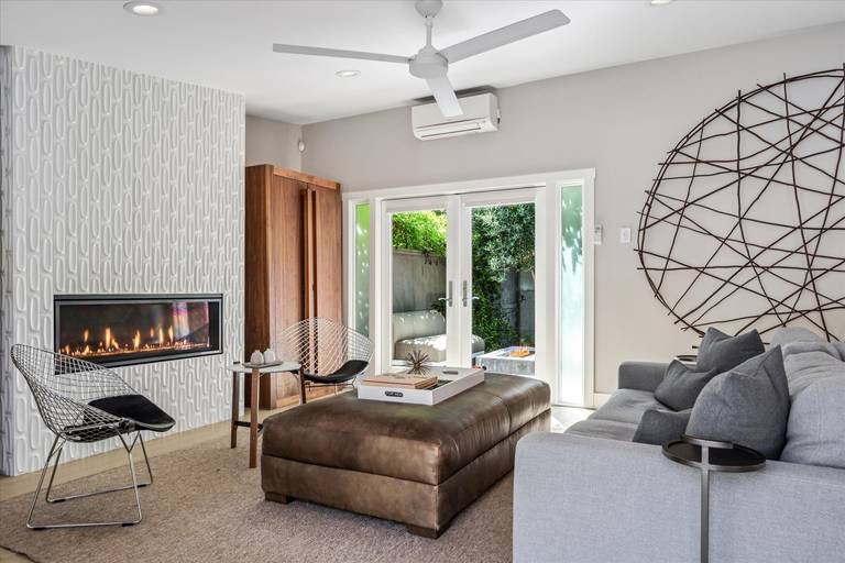 - Living Room- French doors that open to both the front courtyard and the back patio areas bring the outdoors in! Cozy Gas fireplace, Flat screen TV, comfy furnishings