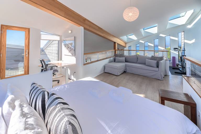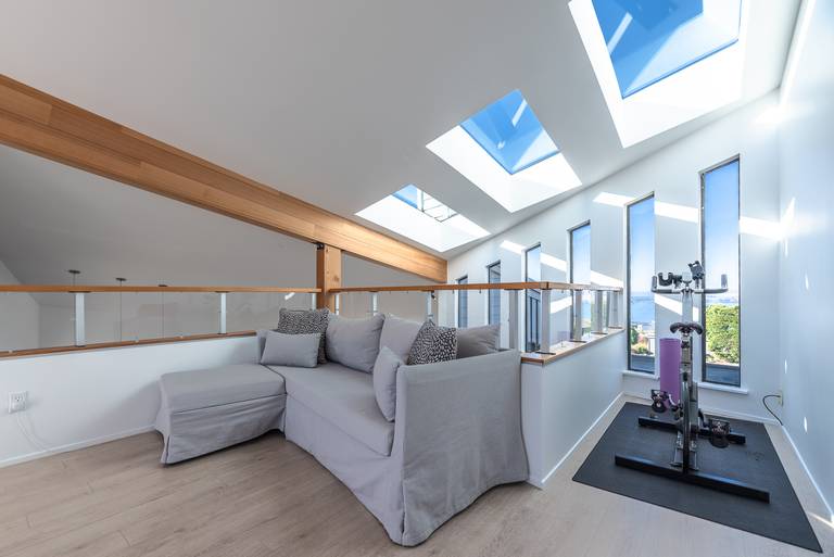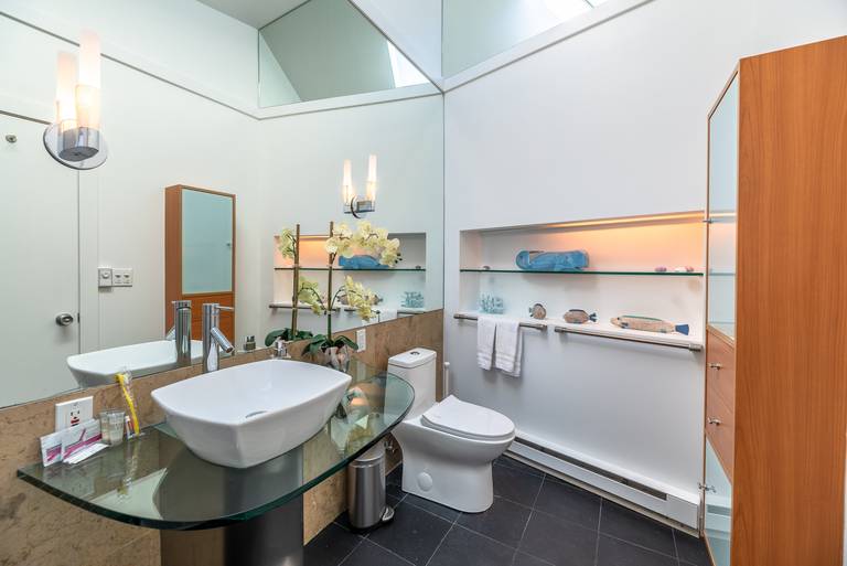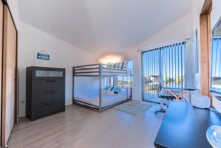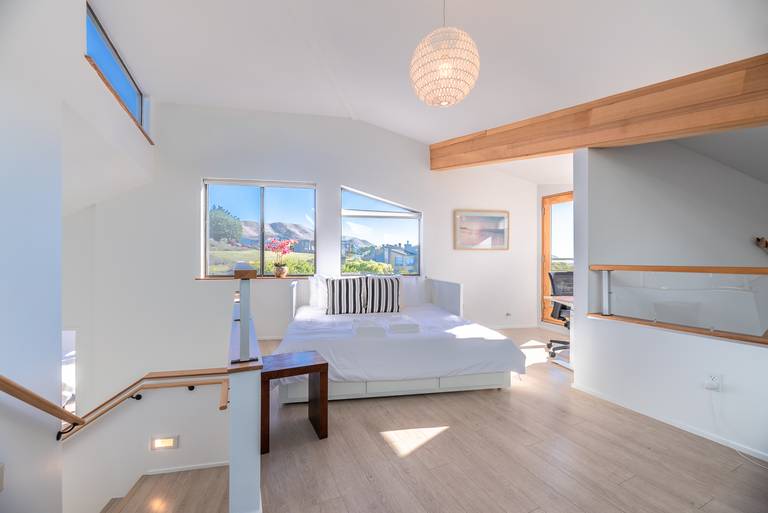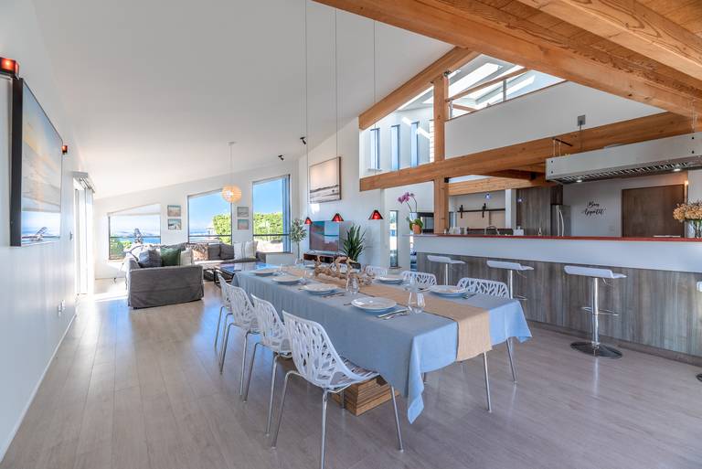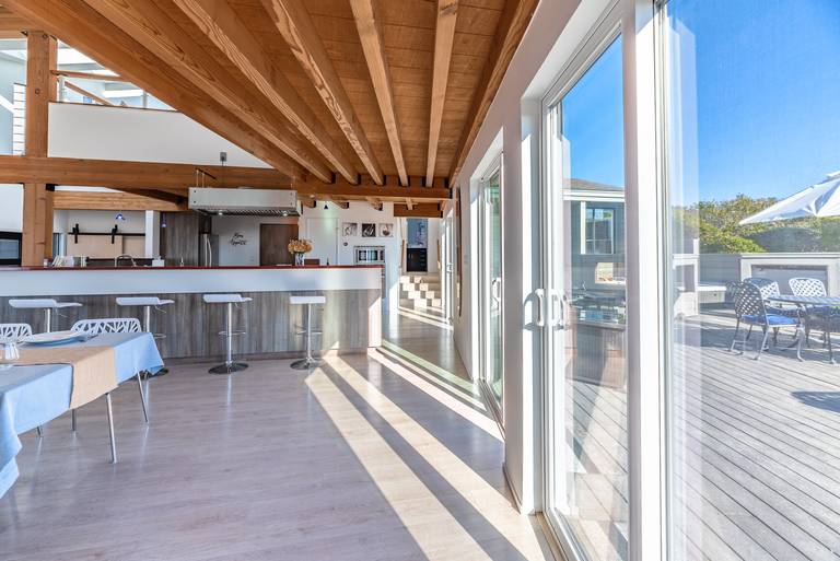 Beautiful deck and gorgeous view from the deck. We really enjoyed the little gas fire-pit on the deck, it was just enough to take the chill off even though we had great weather. The umbrella was nice on the deck as well, it did get a little hot and sunny at one point too, so both things made the deck really enjoyable - the three of us spent a lot of time there and the furniture was comfy too. The kitchen was well stocked and open to the family room. One thing you should know is the bedroom situation is a little unusual, although it worked for the three of us perfectly. The master bedroom with a very comfortable king bed, glass door to the deck, and awesome view (gorgeous to see the moonlight on the water) does not have an attached bathroom, but the bathroom right next door is very nice and it is close. The bedroom with double bunk beds has the ensuite bathroom. The third sleeping area is in a loft that is up a few stairs but basically open, so no privacy there. Not sure how it would work for more than one couple, but for the family of three of us it was perfect. Would defiantly stay again with our family of three.