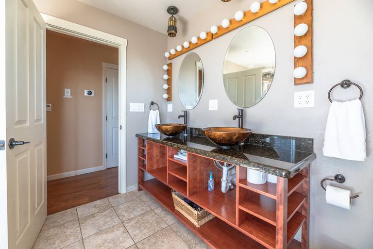 Reviewed on 2025-01-23 by Stephanie G. , Sonoma, CA USThe view & location are amazing, the house itself is getting a bit dated and could use a refresh. Kitchen was well stocked, small appliances were older but most worked, pots/pans were in good shape & plenty of dish ware. The dishwasher door spring was not quite working so the door would not stay down. The shower values were extremely complicated which was quite surprising for a rental house. The bedrooms were definitely in need of fresh paint, you could see where there had been a leak from the upstairs bathroom into the lower bedroom and the touch up paint did not quite match. The upstairs bed had a nice mattress topper, the 2 downstairs beds could have used one too as the mattresses were quite firm. Hot tub was great and worked well, easy to operate, plenty of outdoor furniture! The garage/game room was really well stocked but we stayed in Jan when it was colder so it was really cold being in the garage w/o heaters.